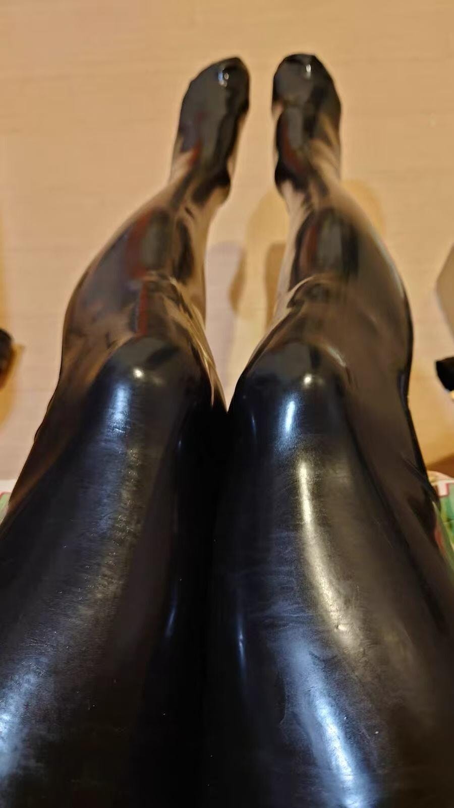 Apply talcum powder or silicone lube inside stockings and on your legs. Gather the stocking, insert your toes, then gradually pull up your leg. Smooth out wrinkles and air bubbles as you go. The process is similar to putting on regular stockings but requires more care due to the latex material.
