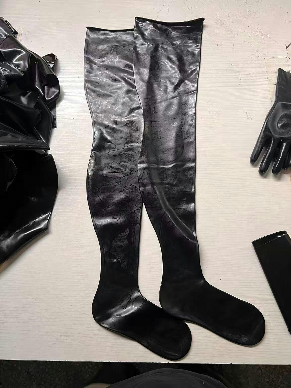 Latex stockings are thigh-high hosiery made from latex rubber that creates a second-skin sensation. These stockings extend from toes to upper thigh (60-72cm length) with closed foot design, providing seamless leg coverage. Unlike toe stockings, these have traditional closed-toe construction like regular stockings.